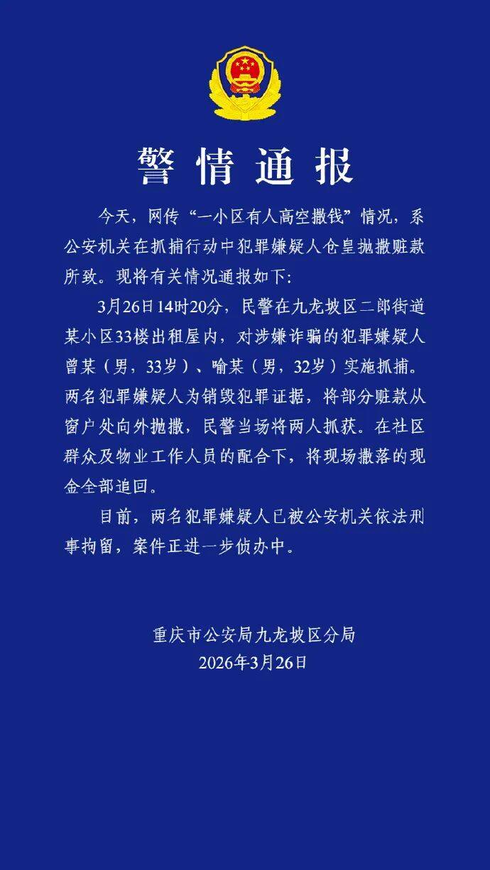 3月26日14时20分,民警在九龙坡区二郎街道某小区33楼出租屋内,对涉嫌诈骗的犯罪嫌疑人曾某(男,33岁)、喻某(男,32岁)实施抓捕。两名犯罪嫌疑人为销毁犯罪证据,将部分赃款从窗户处向外抛撒,民警当场将两人抓获。在社区群众及物业工作人员的配合下,将现场撒落的现金全部追回。